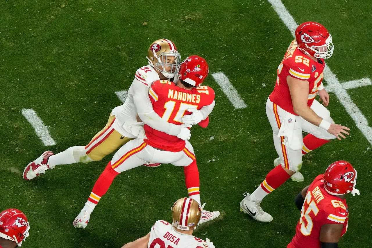 Arik Armstead sacks Chiefs Quarterback Patrick Mahomes in Super Bowl 58. PHOTO CREDIT: AP Photo, David J. Phillip
