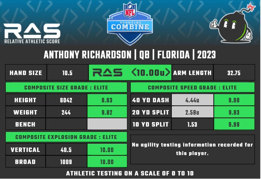 It is without question that Richardson is a unicorn and generational prospect talent coming out of Florida and in this year’s quarterback draft class. In fact, at the combine, Richardson scored a perfect 10.00 relative athletic score (RAS) which measures how athletic a prospect is based on six of any of the following metrics: Height, Weight, Forty-yard dash, Twenty-yard split, Ten-yard split, Bench Press, Vertical Jump, Broad Jump, Short Shuttle, and 3-Cone. The only other quarterbacks to ever score a 10.00 RAS are Cam Newton (who Richardson is nearly identical to physically) and Daunte Culpepper.