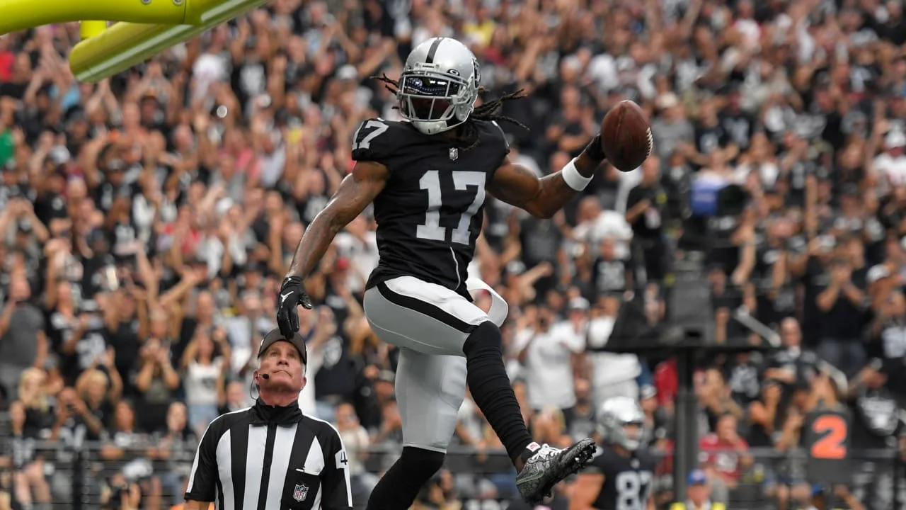 Davante Adams celebrates a first quarter touchdown as the Raiders take an early 7-0 lead over the Cardinals. 09-19-2022 - Raiders
