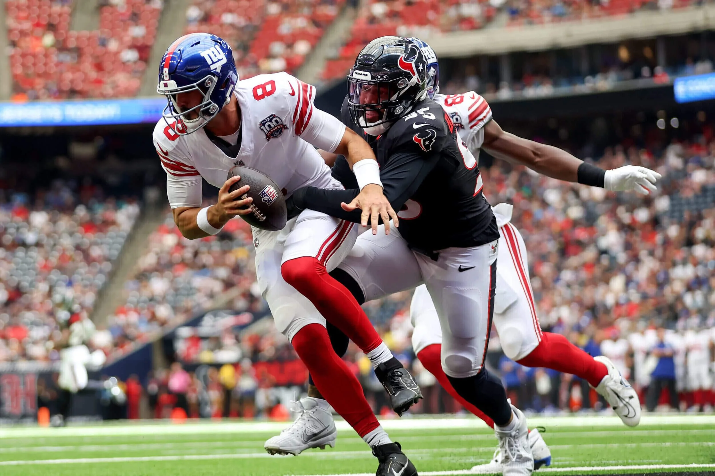On the Giants first drive of the game against Houston’s starters, Jones almost threw an interception, which was luckily dropped. On their second drive, Jones made one of the worst decisions of his career which resulted in a Jalen Pitre pick-six. New York was backed up inside their own 10-yard line, when Houston’s pass rush got to Jones. Instead of throwing the ball into the turf, or better yet, throwing it out of bounds, he “pump faked” and then thew it directly to Pitre. In fact, a safety would have been better than what Jones decided to do.