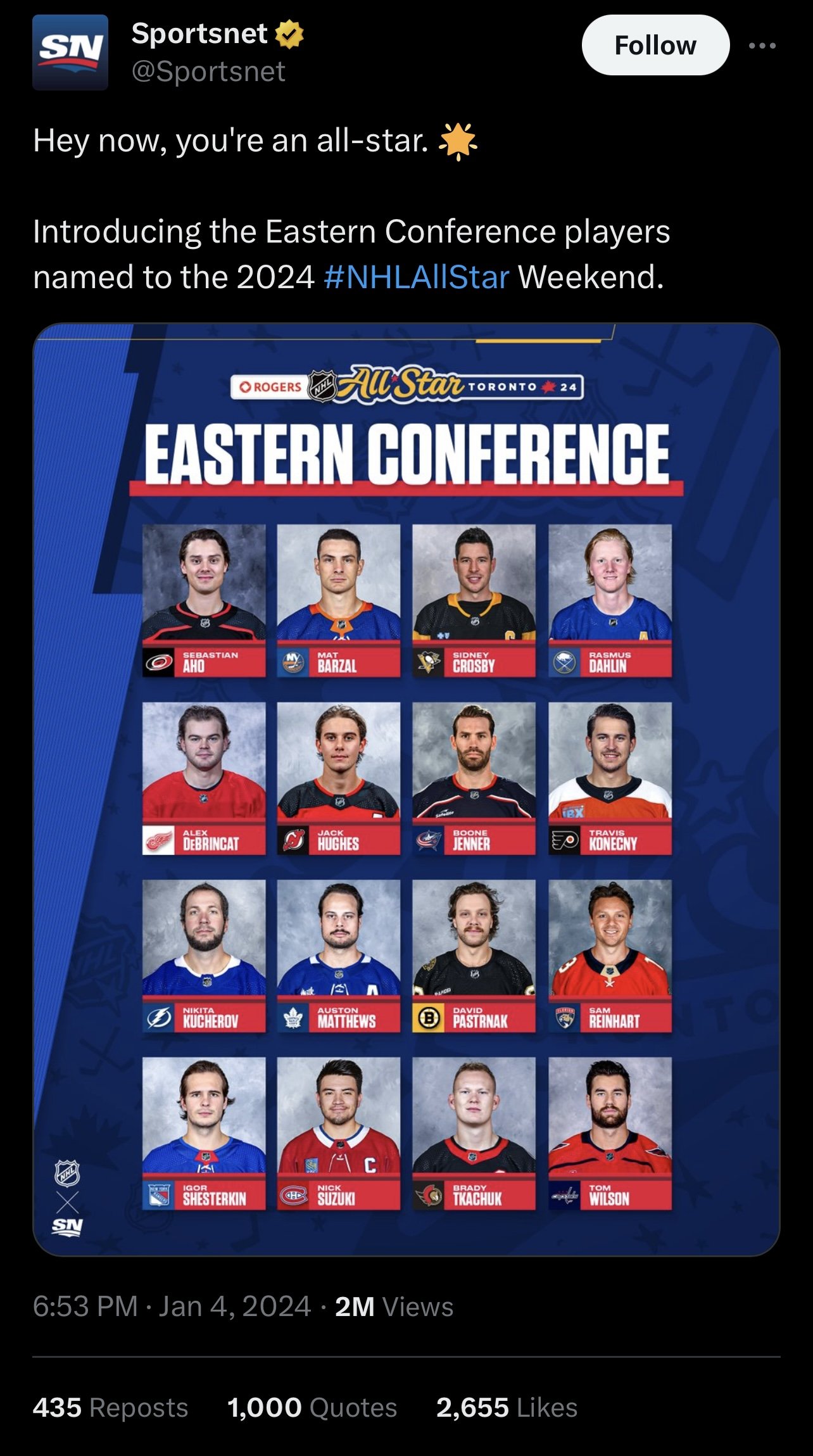 With the rosters set for the 2024 NHL All Star game, it is expected to be a good one with the amount of talent from both sides. The Metropolitan division all stars are Sebastian Aho, Boone Jenner, Jack Hughes, Mathew Barzal, Igor Shesterkin, Travis Konecny, Sidney Crosby, and Tom Wilson.