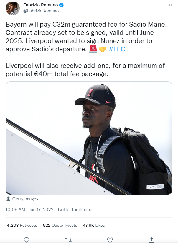 Bayern Munich and Liverpool have agreed to an initial fee of €32 million for Senegalese winger Sadio Mane. The deal includes add-ons, based on Mane’s performance, that might up that number to €40M. This will be the club’s third signing this summer, after the duo from AFC Ajax, right-back Noussair Mazraoui and central midfielder Ryan Gravenberch. Mane is capable of playing as winger on both flanks, or even in the false 9 role, which had usually been his starting position ever since Luis Diaz joined Liverpool. The addition of a world-class attacker like Mane will be crucial for the Bavarian side, especially since Robert Lewandowski and Serge Gnabry might be on the way for a move.